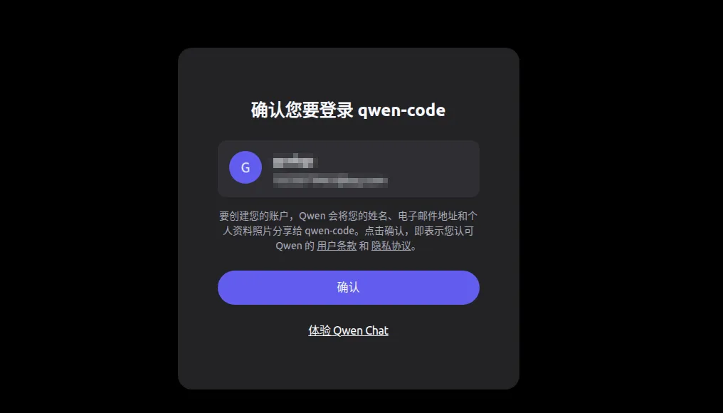 然后会启动浏览器进入千问登录界面,我这里登录过,直接确认即可