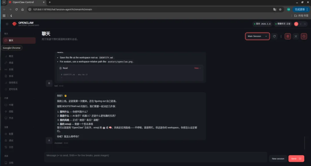 后续在浏览器输入网址127.0.0.1:18789打开OpenClaw的面板。