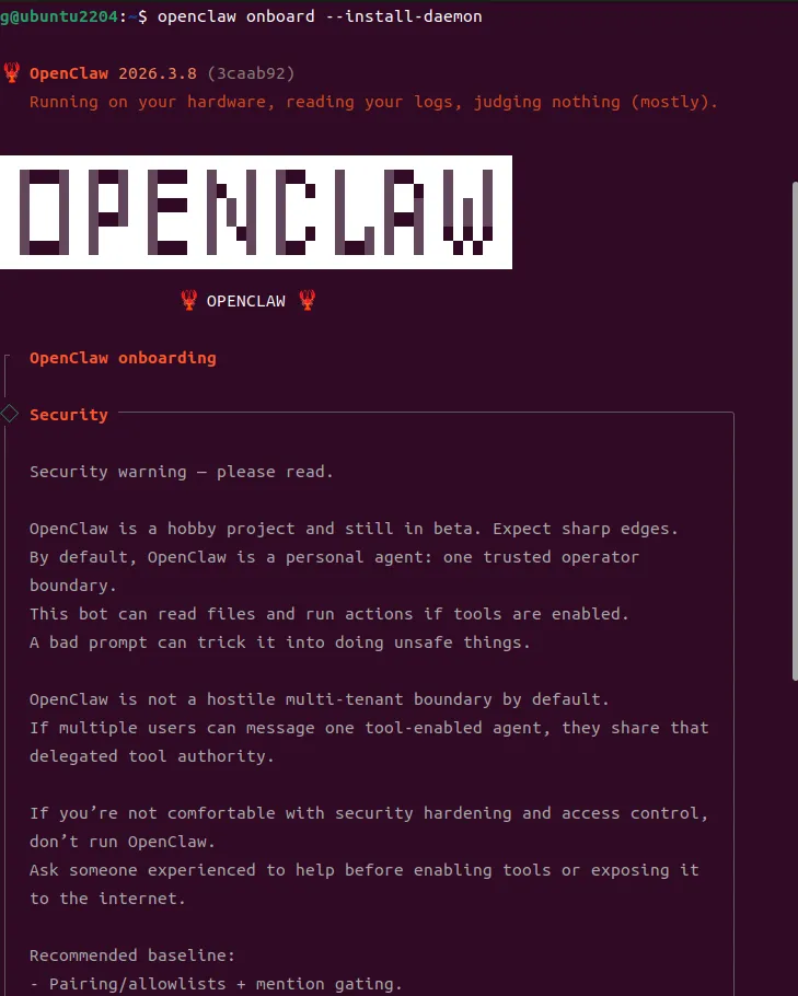 openclaw onboard --install-daemon这样就会启动openclaw的新手引导配置界面,后续操作跟之前介绍的一样。