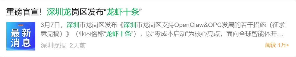 就在同一周,深圳龙岗区发布了被业界称为"龙虾十条"的专项政策,对OpenClaw相关开发给予最高200万元补贴,并喊出"零成本启动"的口号。紧接着,无锡、合肥、常熟等各地政府竞相出台"养虾"政策——魔幻到我看到新闻的时候都要反应一下是真的能吃的龙虾还是赛博龙虾。