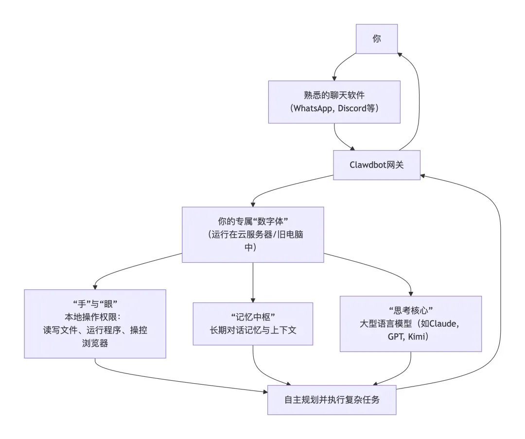 OpenClaw是本地部署的AI智能体框架。它的核心价值在于三点:本地权限(可以直接操控你的文件系统、浏览器、应用程序)、长期记忆(不像云端对话每次重置,它记得你的习惯和历史,.md文件比云端的agent context能存储更多的细节和长记忆)、以及高度定制化(你可以为它写非常具体的工作流,接入你私有的数据和工具链)。