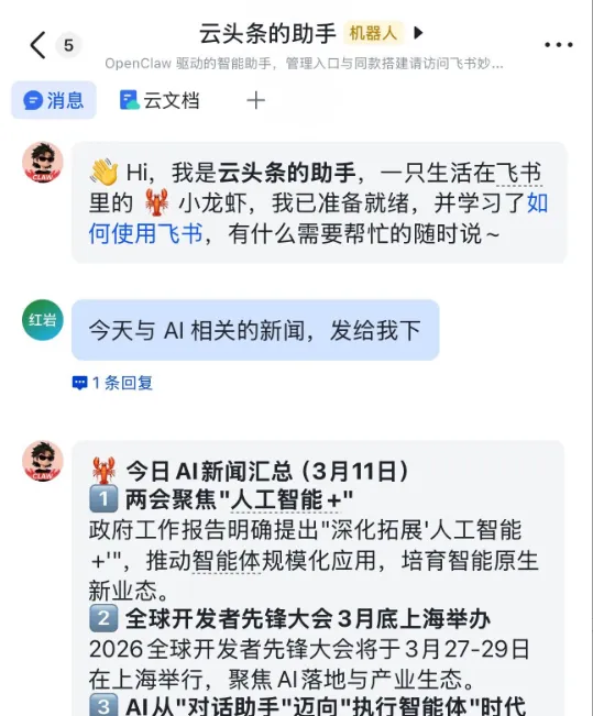 企业里一旦有人用龙虾接入了飞书,就会带动整个团队对飞书的依赖——这是绝佳的用户增长场景。