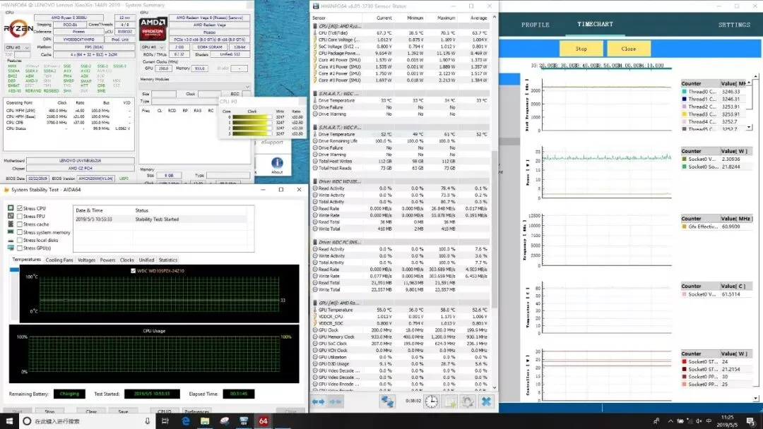 在满载状态下,CPU温度最高67.3℃,功耗22W,频率维持在3.25GHz。
