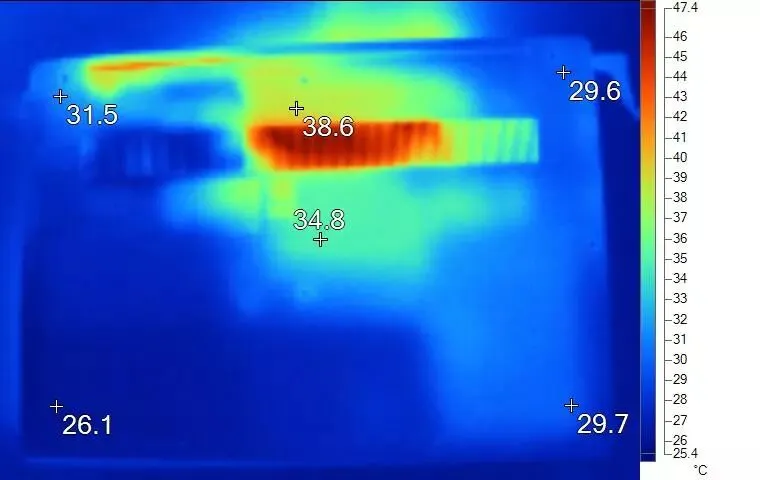 背面温度如上图所示,最高温度38.6℃,中心点温度34.8℃。