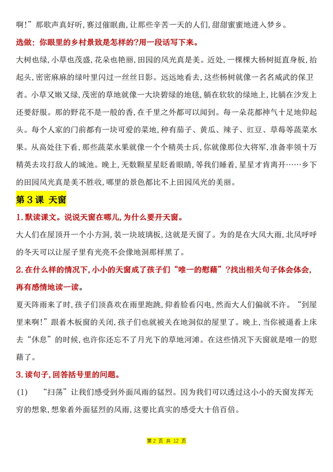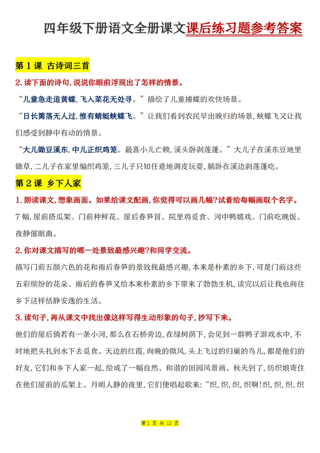 【免费下载】四年级(下)语文 全册课文课后练习题参考答案 电子版