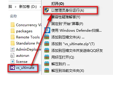 3.选中vs_ultimate,鼠标右击选择“以管理员身份运行”