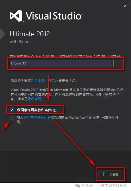 4.选择软件安装路径,勾选我同意许可条款和隐私策略,取消勾选加入体验改善,点击“下一步”
