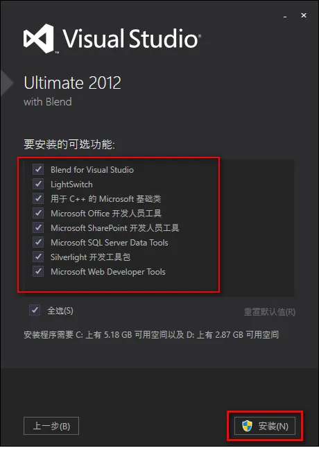 5.勾选自己需要的功能,点击“安装”