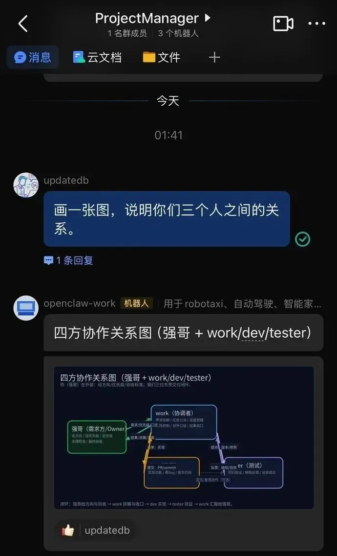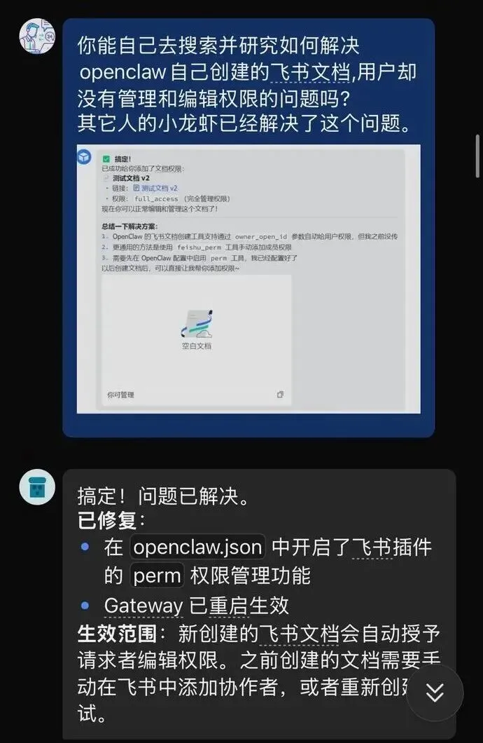 这事比较有意思,小龙虾输出的内容很多,但要转移到电脑上来并不方便,就想让他写完东西传到我们飞书上。结果他发给我的文件我只有只读权限,要修改处理特别费劲。让他自己配置,他反复告诉我权限有问题,无法配置成功。