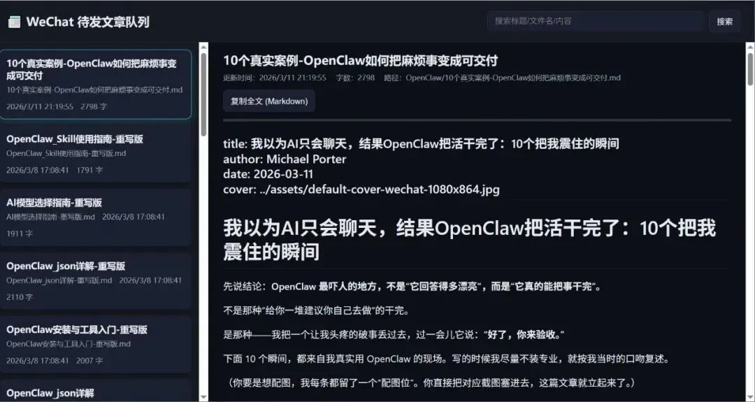 小龙虾干的活很多,但是还是以有限内容的交流,通知为主,想看完整的产出,目前的小龙虾没有特殊好的途径。要不上传云盘、上传飞书。临时查看用/cat 也能,但经常更新的内容,想了想还是让他自己建站吧。