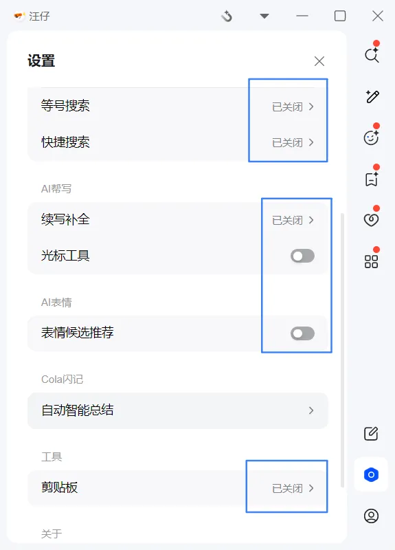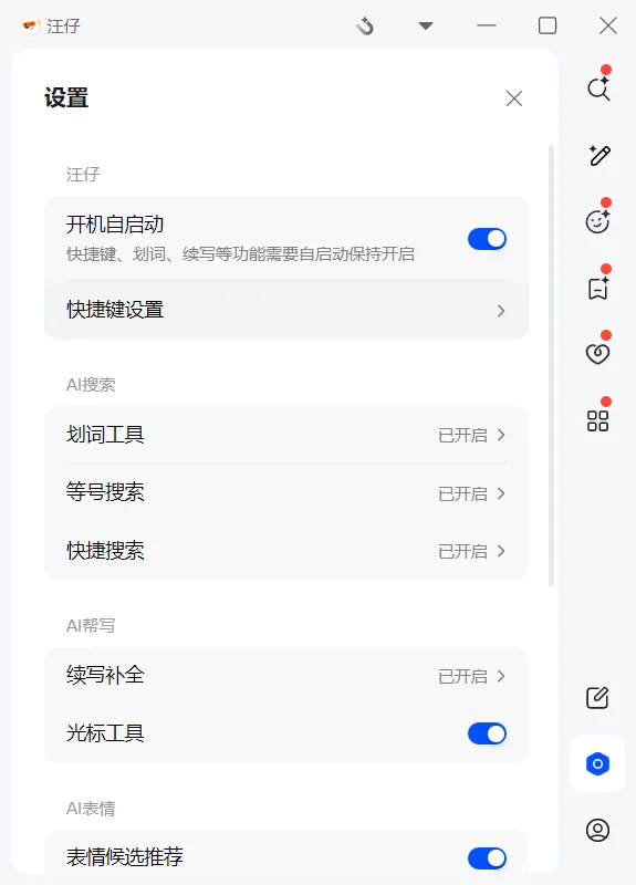 在设置界面右边菜单找到 “AI汪仔设置”(有些版本叫“汪仔”),点进去后你会看到这个: