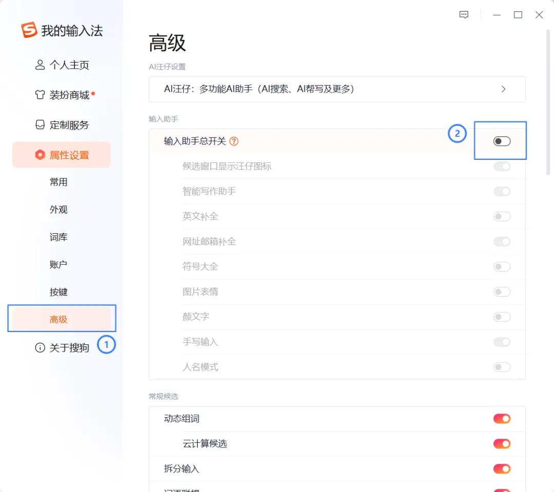 1. 关掉“输入助手”里的多余功能