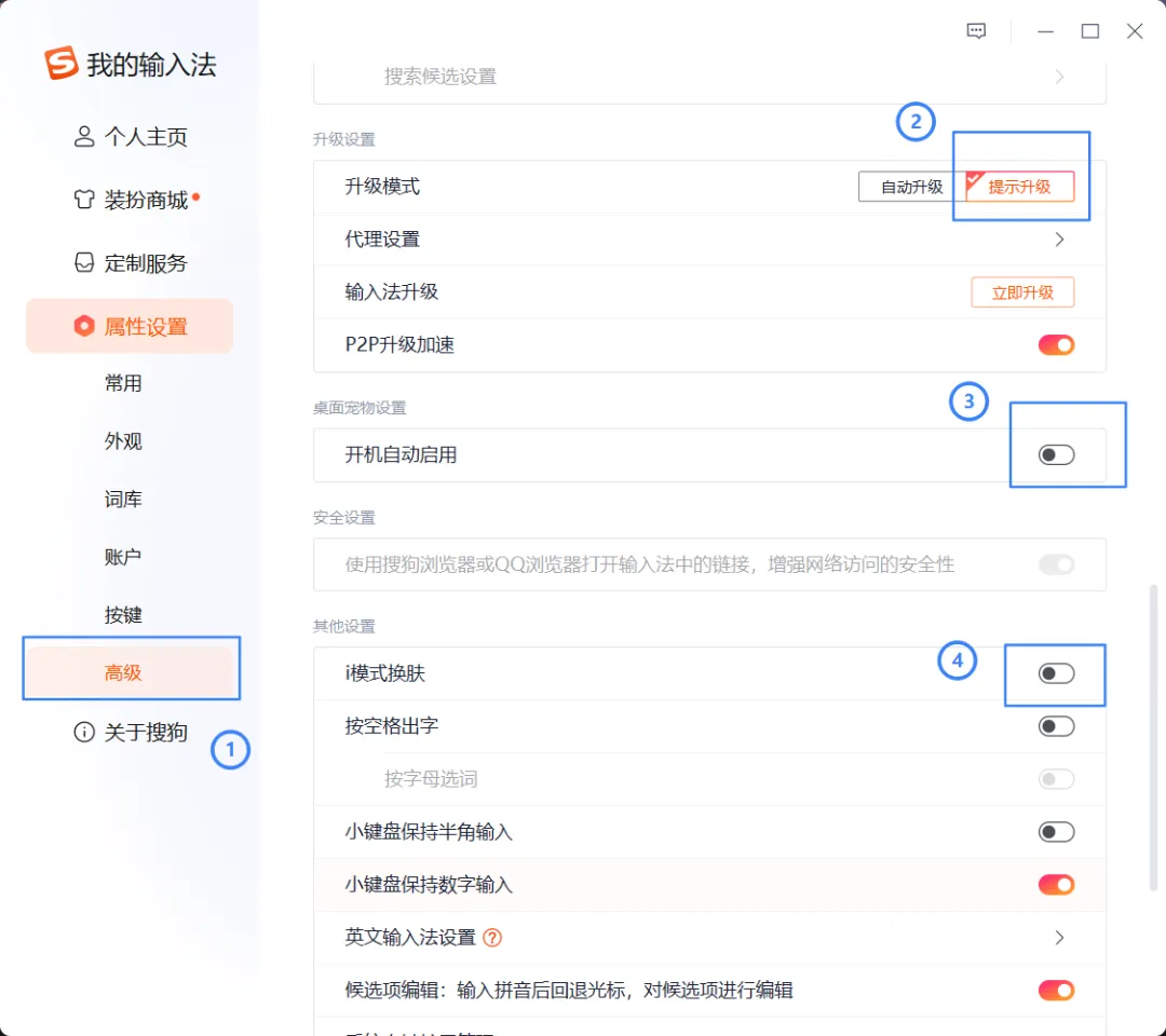 还是在“高级”设置里,找到“升级设置”:i模式换皮肤、开机开机自启动(桌宠)也要关掉。