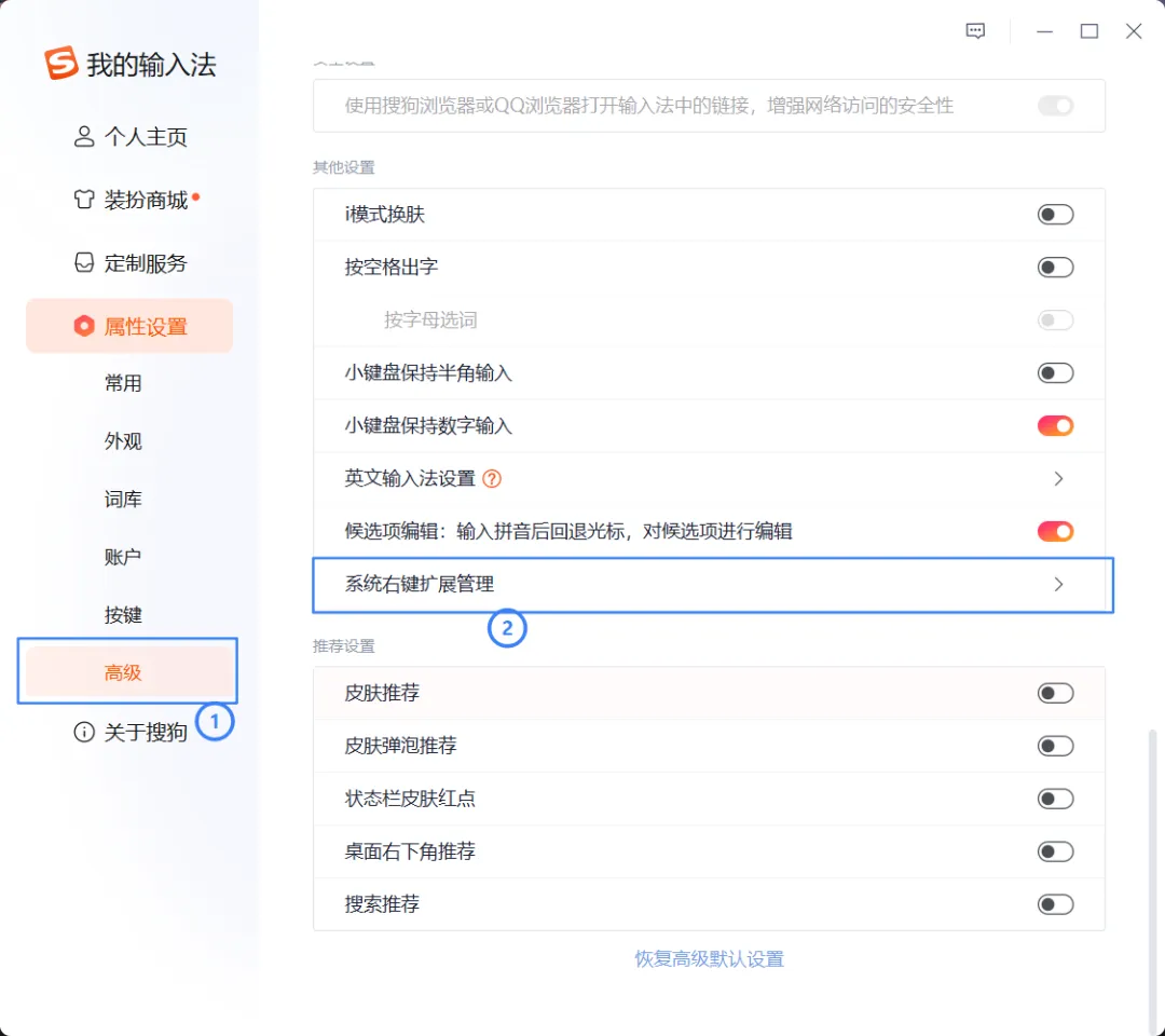 在“高级”设置里,找到 “系统右键扩展管理”。