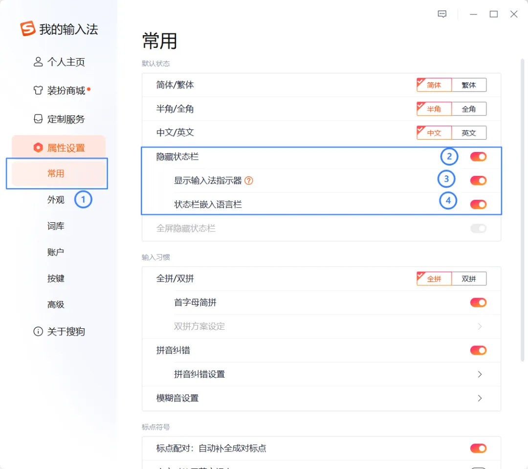 在桌面打字的时候,是不是总有个S图标飘着?在“常用”设置里,找到 “隐藏状态栏”,勾上它。