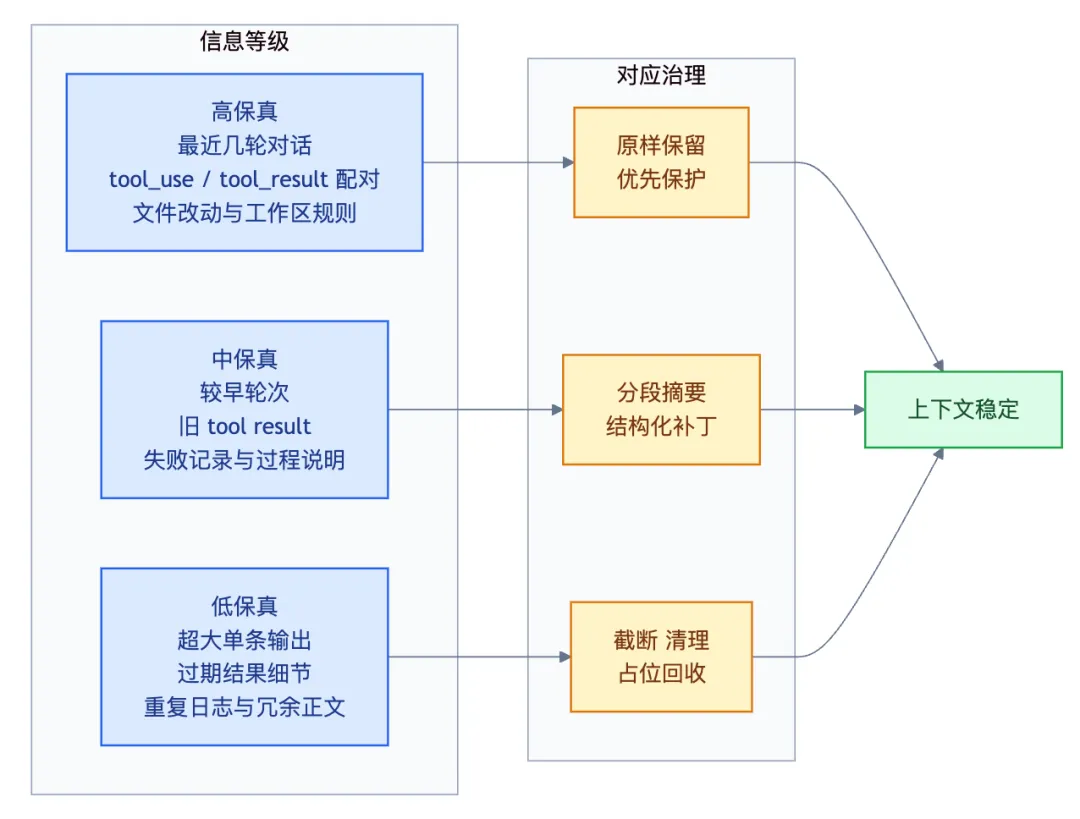 • 哪些信息可以直接删。 • 哪些信息只能裁剪,不能完全清掉。 • 哪些信息可以摘要,但摘要后还得补回关键结构。 • 哪些信息绝对不能丢,一旦丢了,系统行为就会漂。