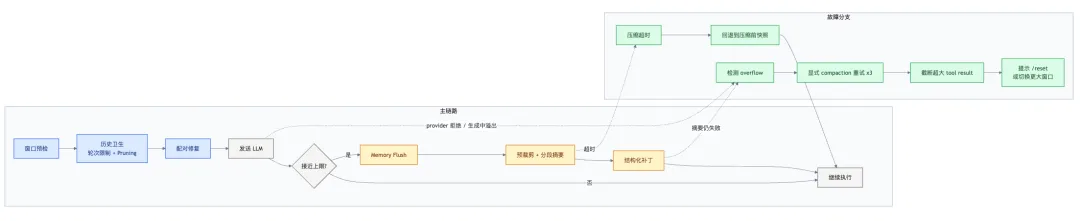 OpenClaw 这套实现最有参考价值的地方,恰恰在这里。它把“上下文压缩”从一个 prompt 技巧,做成了一种系统能力。