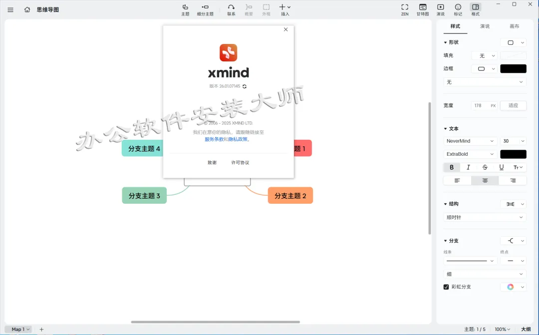 AI智能项目拆解:一键将项目需求转化为个性化WBS(工作分解结构),支持多格式、多语言信息整合,自动生成任务框架。 甘特图与思维导图双视图同步:在思维导图与甘特图间无缝切换,任一视图调整任务时间、依赖或进度,另一视图实时更新,实现“结构推演”与“时间落地”双轨协同。 AI原创插画库:新增310张AI生成插画,支持关键词检索即得,可直接插入主题增强视觉表达。 富文本局部样式:支持对主题内单个文字进行独立设置字体、颜色、加粗、斜体等样式,突出重点信息。 自动编号系统:可为兄弟主题一键应用多种编号样式(如1.1、A.1、•等),无需手动标记,提升结构化表达效率。 任务管理增强:支持为任务指定负责人、优先级、开始/截止日期、进度百分比,并自动计算整体完成率。 任务导出至日历与表格:一键导出任务至ICS日历格式或CSV表格,无缝对接Outlook、Google Calendar、Excel等工具。 无限导图与实时协作:取消导图数量限制,支持多人实时编辑、动态跟随视角、云端自动同步与30天版本历史。 密码保护与加密存储:文件可设置密码,结合多重加密技术保障敏感内容安全。