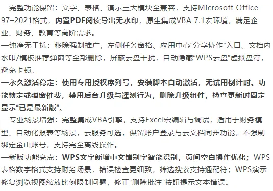 使用专用授权序列号永久激活、去广告、集成VBA、免升级,办公环境纯净无打扰。