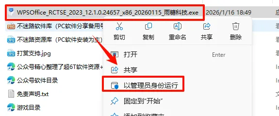 2.打开刚刚解压的文件夹,鼠标右键点击“WPSOffice_雨糖科技特别版_2023_12.1.0.25225_x86_20260306.exe”选择“以管理员身份运行”