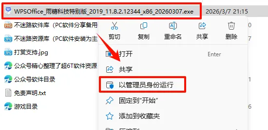2.打开刚刚解压的文件夹,鼠标右键点击“WPSOffice_雨糖科技特别版_2019_11.8.2.12344_x86_20260307.exe”选择“以管理员身份运行”