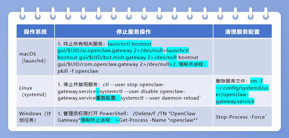 若openclaw命令不可用,但后台服务仍运行,需按操作系统手动停止服务并清理: