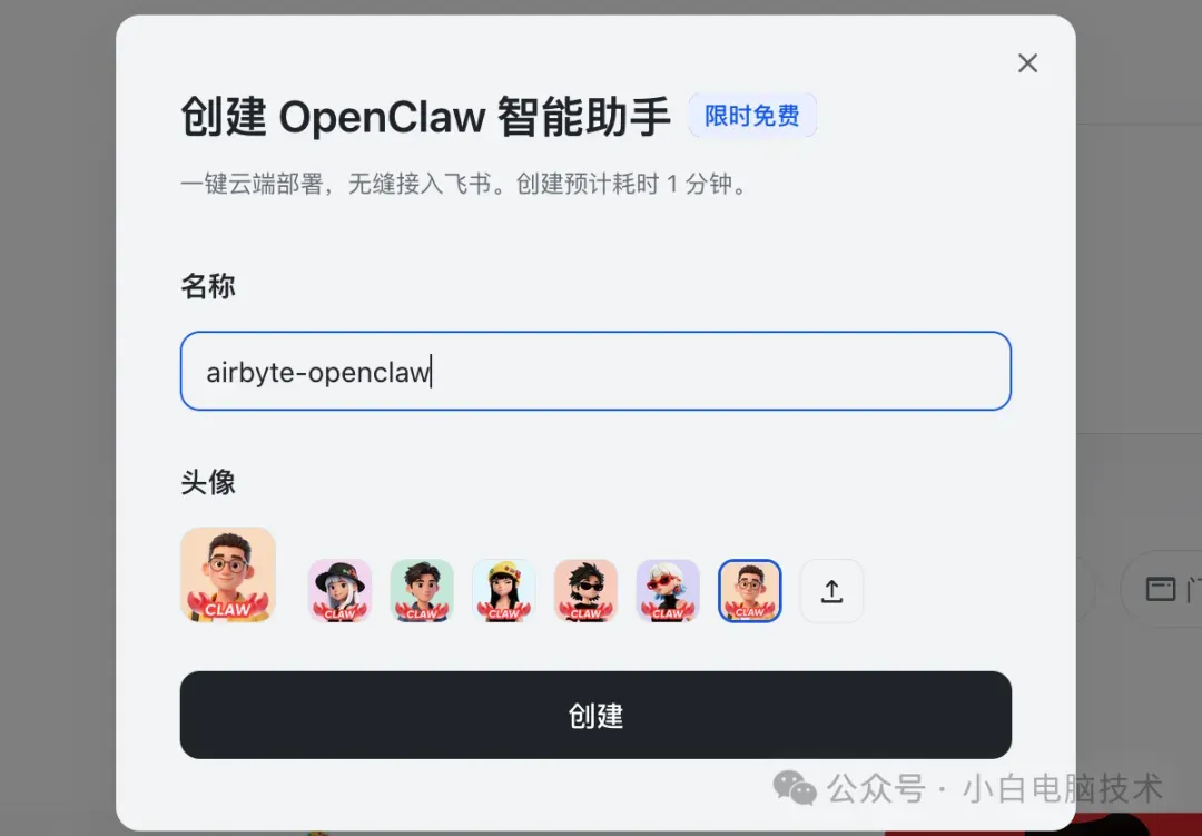 给你的OpenClaw起个名字(比如“我的小龙虾”),然后点击【创建】。