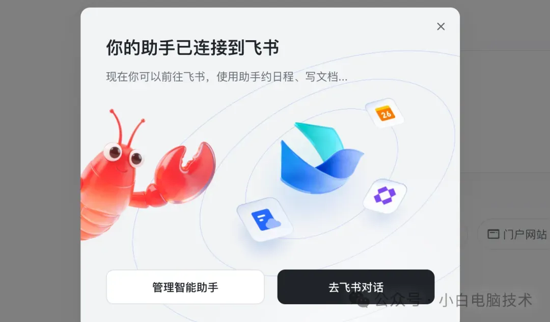 创建成功后,你会看到两个选项:【管理智能助手】和【去飞书对话】。