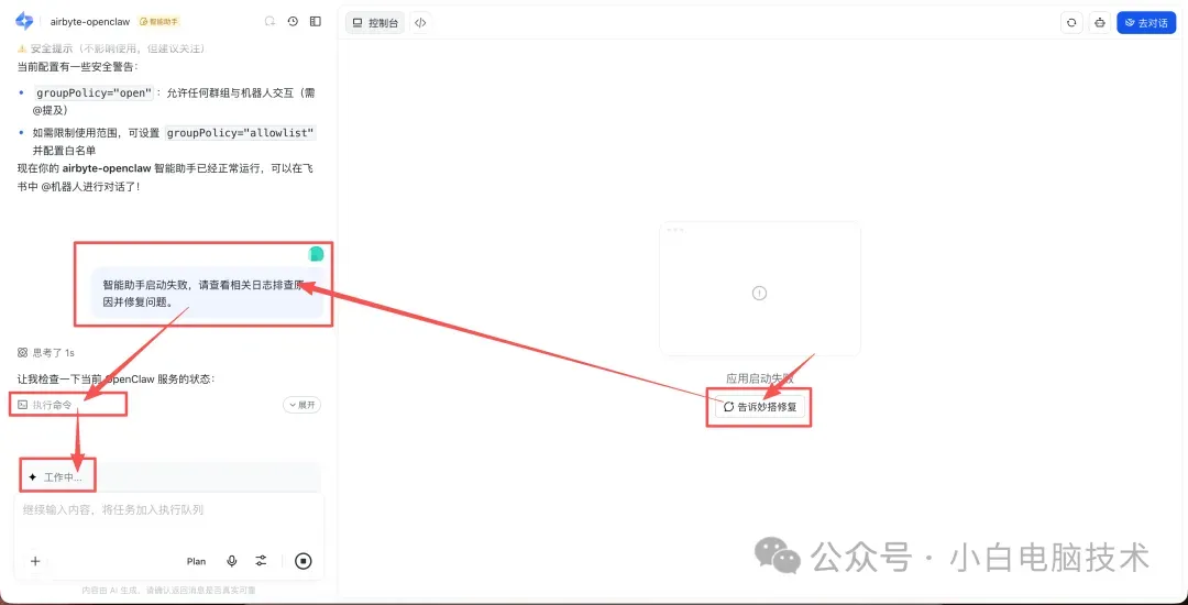 但妙搭有个贴心的功能:点击【告诉妙搭修复】,左边窗口就会自动执行修复脚本。