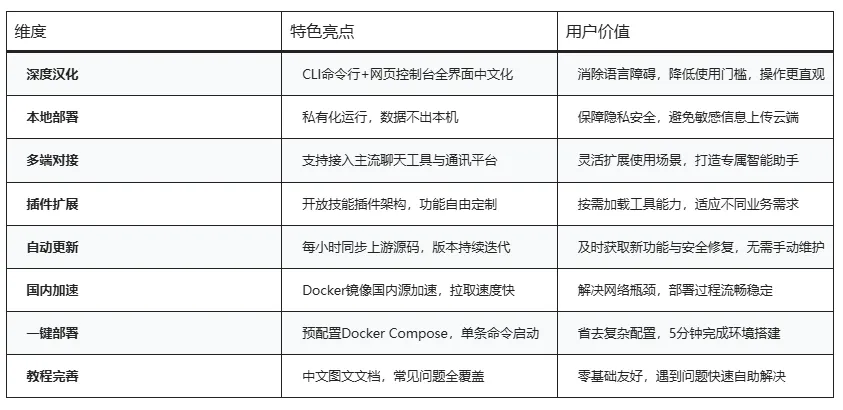 OpenClaw汉化版 | 智能AI助理本地部署工具_中文CLI控制台_Docker一键安装OpenClaw汉化版是一款专为国内用户打造的智能AI助理本地部署解决方案,基于开源项目深度中文化改造,提供命令行控制台全中文界面与网页可视化控制台双模式操作。项目对接主流聊天工具,支持技能插件扩展,满足个性化智能助理需求。 针对国内网络环境优化,提供Docker一键部署方案与国内加速镜像,每小时自动同步上游官方更新,确保功能与安全补丁及时跟进。配备详细中文部署教程,零基础用户也能快速完成本地搭建,实现数据私有化与定制化AI服务。核心特点与功能优势表格目标用户与使用场景开发者:本地调试AI应用,快速验证功能原型隐私敏感用户:数据本地化处理,避免云端泄露风险极客玩家:自建智能助理,对接个人聊天工具与工作流企业团队:内网部署专属AI服务,定制业务插件学习爱好者:研究AI助理架构,二次开发扩展功能关注下方公众号,发送关键字260312获取。