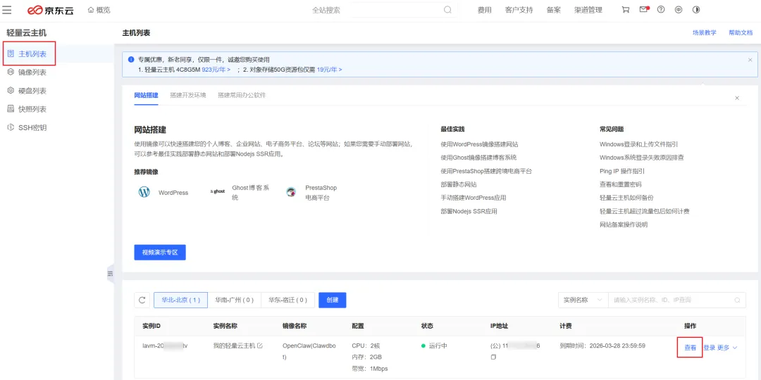 通过京东云账号购买轻量云主机后,注册手机号会收到轻量云主机的密码。通过浏览器打开京东云www.jdcloud.com管理页面,点击轻量云主机。