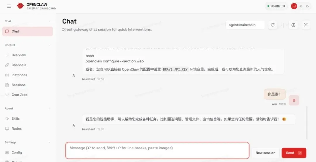 出现OpenClaw的Web交互网站,可以直接和AI助手对话了