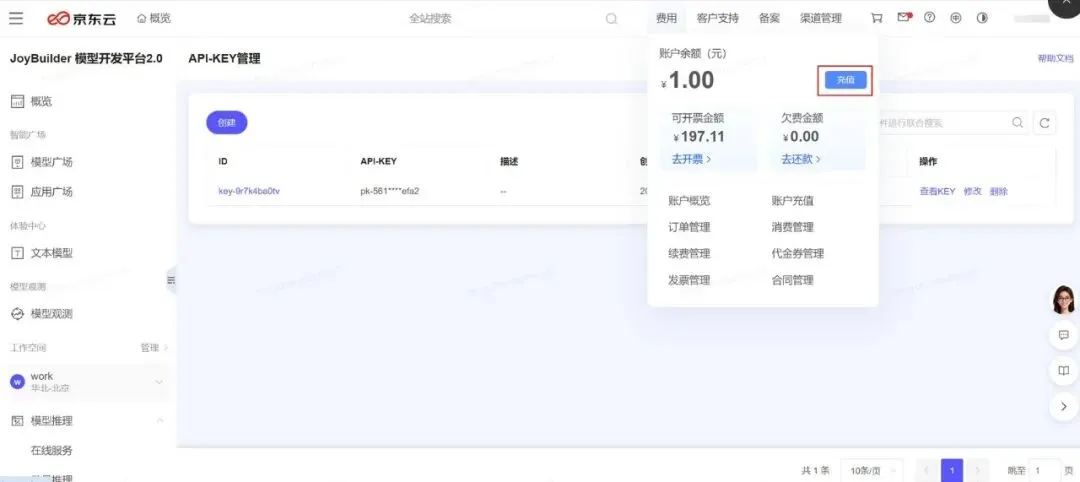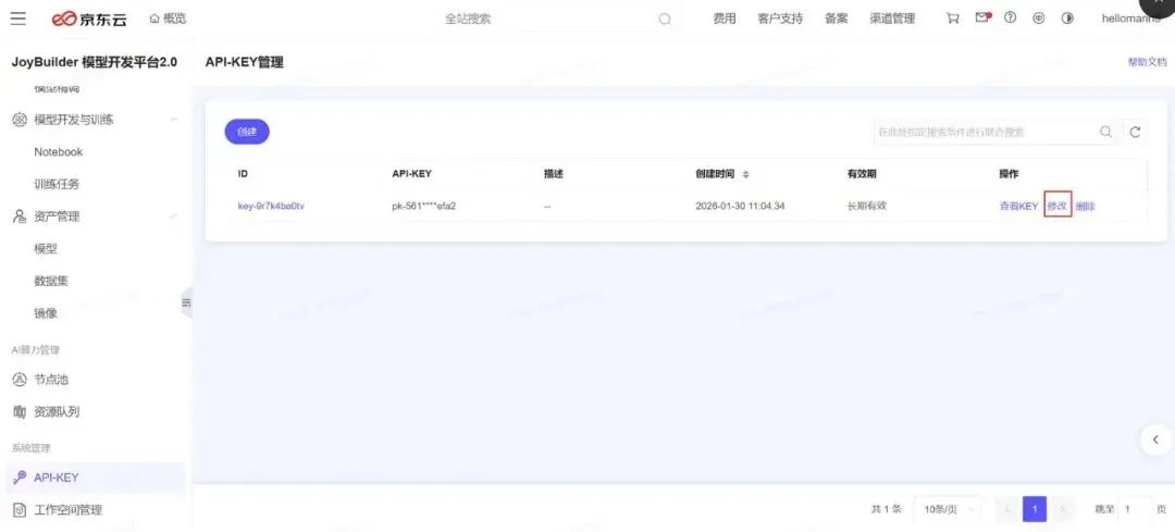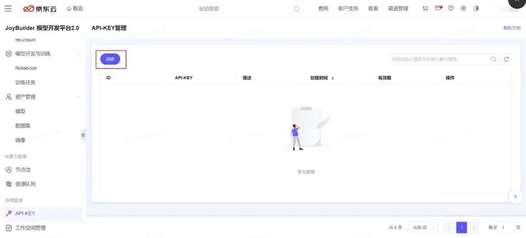 登录京东云JoyBuilder 模型开发平台 2.0,进入API-KEY 管理页面: