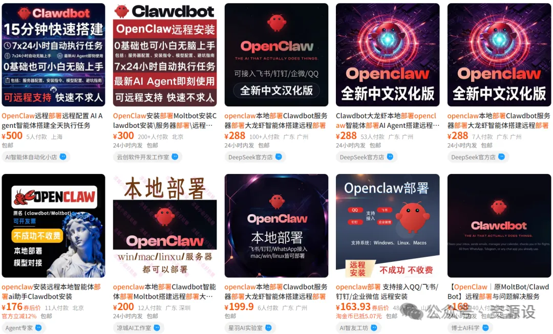 目前各类平台上,已出现大量提供OpenClaw上门及远程安装调试的服务,其中远程安装服务定价300元,上门安装调试服务定价500元,高端定制类服务则以1000元为起售价。