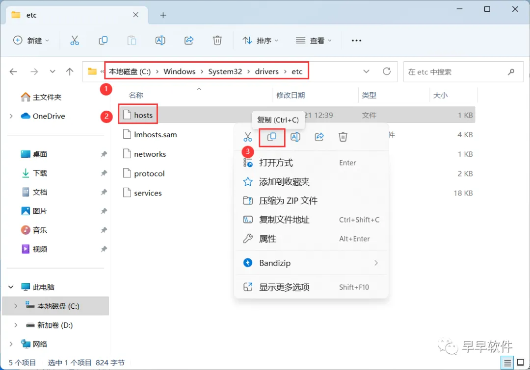 10、打开路径:C:/Windows/System32/drivers/etc,找到【hosts】文件,再右键点击【复制按钮】