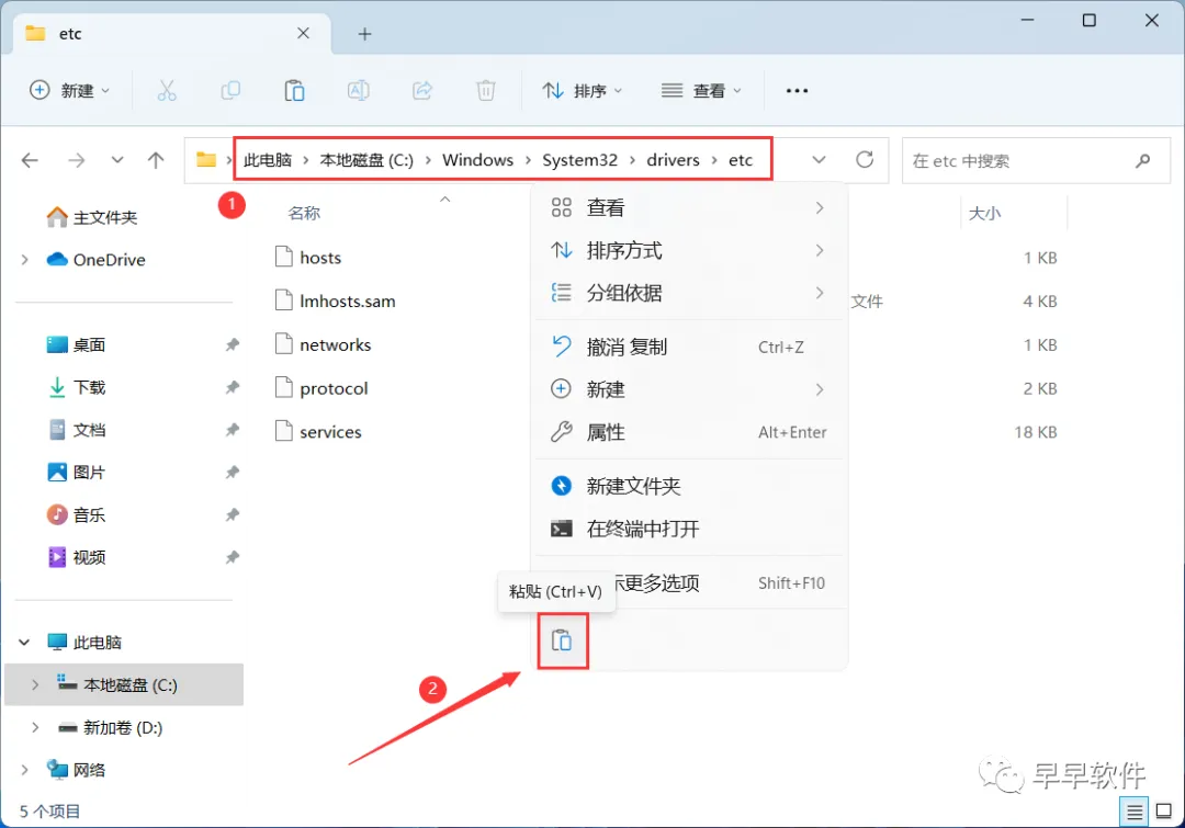 17、回到路径文件夹:C:/Windows/System32/drivers/etc,右键文件夹的空白处,点击【粘贴按钮】