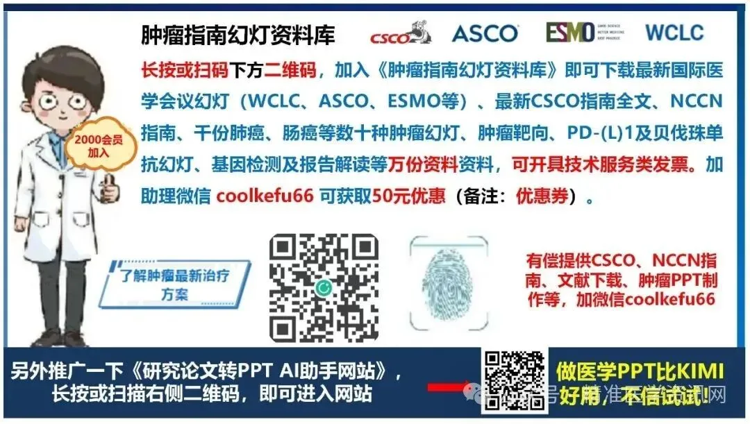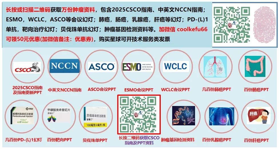 【2025CSCO指南及更新幻灯;肺癌、乳腺癌、肠癌等PPT;WCLC、ESMO、ASCO会议幻灯;免疫治疗幻灯;肿瘤基因检测等】获取方法:点击下方卡片,前往【指南幻灯资料库】,对话框回复【CSCO】,获取万份资料