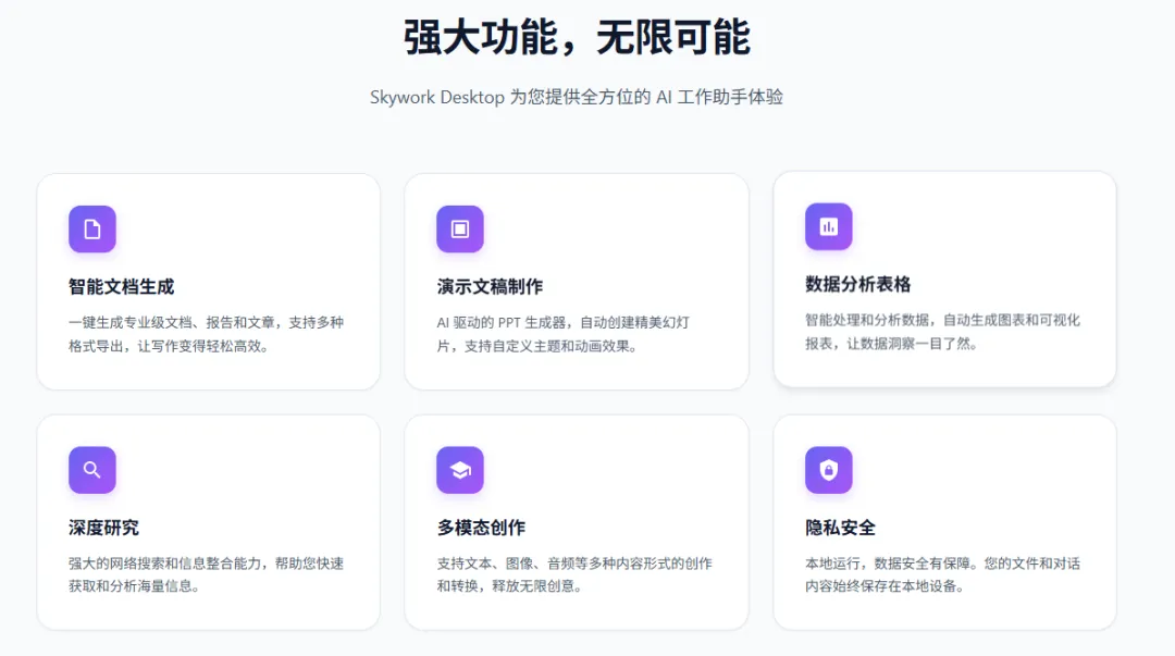 相比传统依赖云端的 AI 助手,天工 Skywork 桌面版最大的不同,在于它把“桌面级生产力”真正落到了本地环境中,既能理解复杂任务,也能直接处理你电脑里的各类文件。
