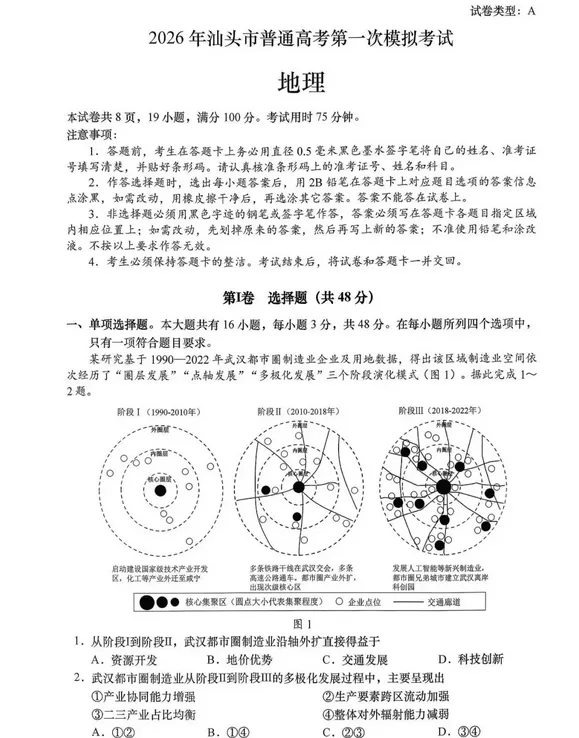 某研究基于 1990—2022 年武汉都市圈制造业企业及用地数据,得出该区域制造业空间依次经历了 “圈层发展”“点轴发展”“多极化发展” 三个阶段演化模式(如图)。据此完成下面小题。1.从阶段 I 到阶段 Ⅱ,武汉都市圈制造业沿轴外扩直接得益于(???)A.资源开发 B.地价优势 C.交通发展 D.科技创新2.武汉都市圈制造业从阶段 Ⅱ 到阶段 Ⅲ 的多极化发展过程中,主要呈现出(???)①产业协同能力增强 ②生产要素跨区流动加强③二三产业占比均衡 ④整体对外辐射能力减弱A.①② B.①④ C.②③ D.③④