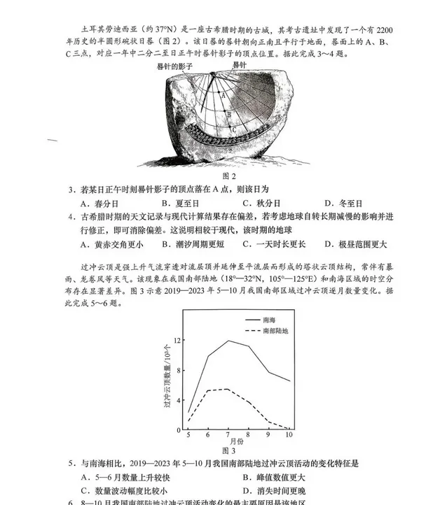土耳其劳迪西亚(约 37°N)是一座古希腊时期的古城,其考古遗址中发现了一个有 2200 年历史的半圆形碗状日晷(如图)。该日晷的晷针朝向正南且平行于地面,晷面上的 A、B、C 三点,对应一年中二分二至日正午时晷针影子的顶点位置。据此完成下面小题。3.若某日正午时刻晷针影子的顶点落在 A 点,则该日为(???)A.春分日 B.夏至日 C.秋分日 D.冬至日4.古希腊时期的天文记录与现代计算结果存在偏差,若考虑地球自转长期减慢的影响并进行修正,即可消除偏差。这说明相较于现代,该时期的地球(???)A.黄赤交角更小 B.潮汐周期更短 C.一天时长更长 D.极昼范围更大