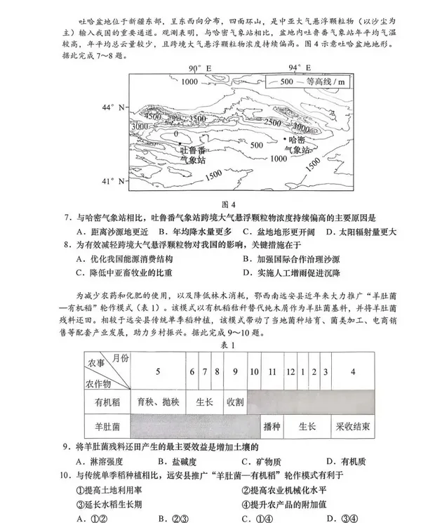 吐哈盆地位于新疆东部,呈东西向分布,四面环山,是中亚大气悬浮颗粒物(以沙尘为主)输入我国的重要通道。观测表明,与哈密气象站相比,盆地内吐鲁番气象站年平均气温较高,年平均总云量较少,且跨境大气悬浮颗粒物浓度持续偏高。下图示意吐哈盆地地形。据此完成下面小题。7.与哈密气象站相比,吐鲁番气象站跨境大气悬浮颗粒物浓度持续偏高的主要原因是(???)A.距离沙源地更近 B.年均降水量更多 C.盆地地形更开阔 D.太阳辐射量更大8.为有效减轻跨境大气悬浮颗粒物对我国的影响,关键措施在于(???)A.优化我国能源消费结构 B.加强国际合作治理沙源C.降低中亚畜牧业的比重 D.实施人工增雨促进沉降