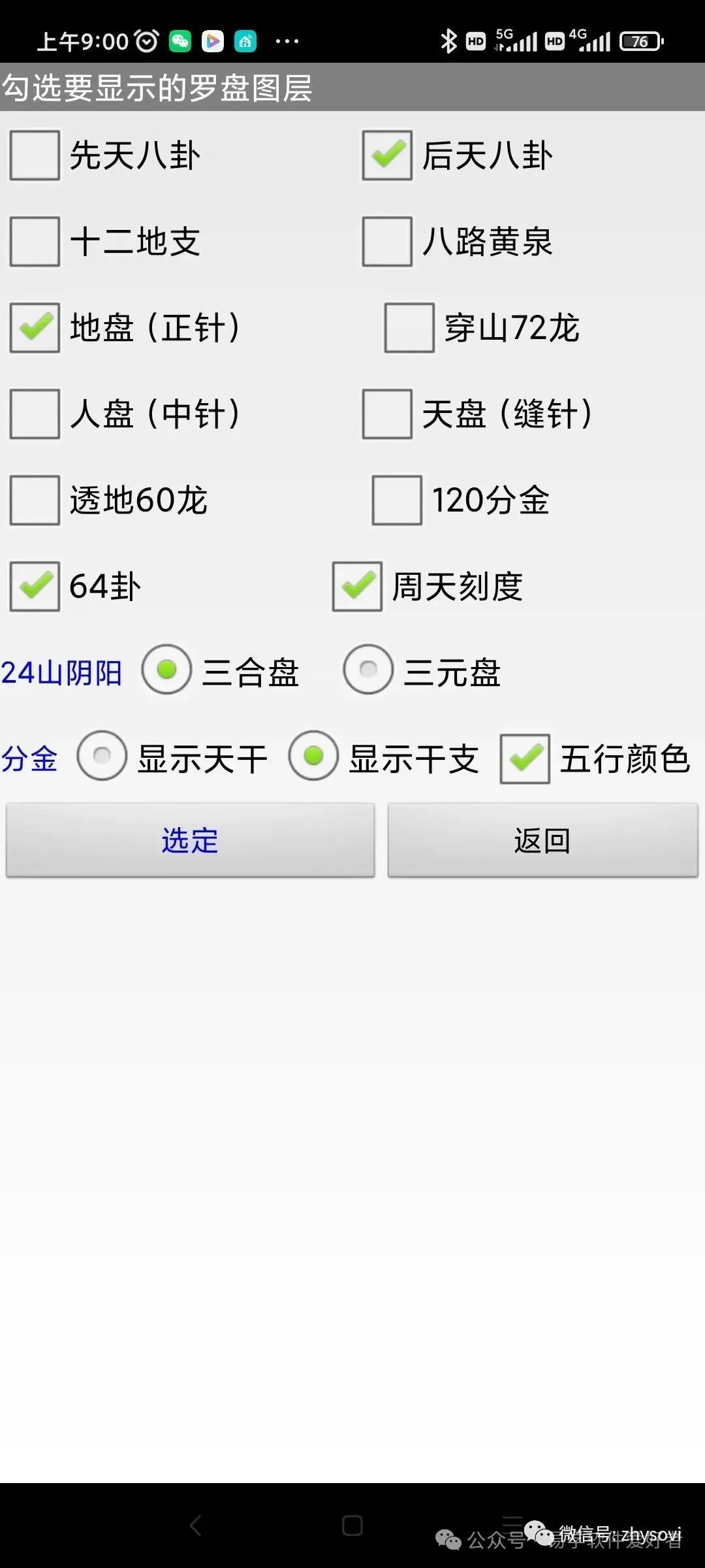 1: 电子罗盘界面下,点击左下角的矩形,可以选择要显示的罗盘图层,有人盘、天盘、穿山72龙、64卦等共12种图层可以选择,自由组合要显示的图层。