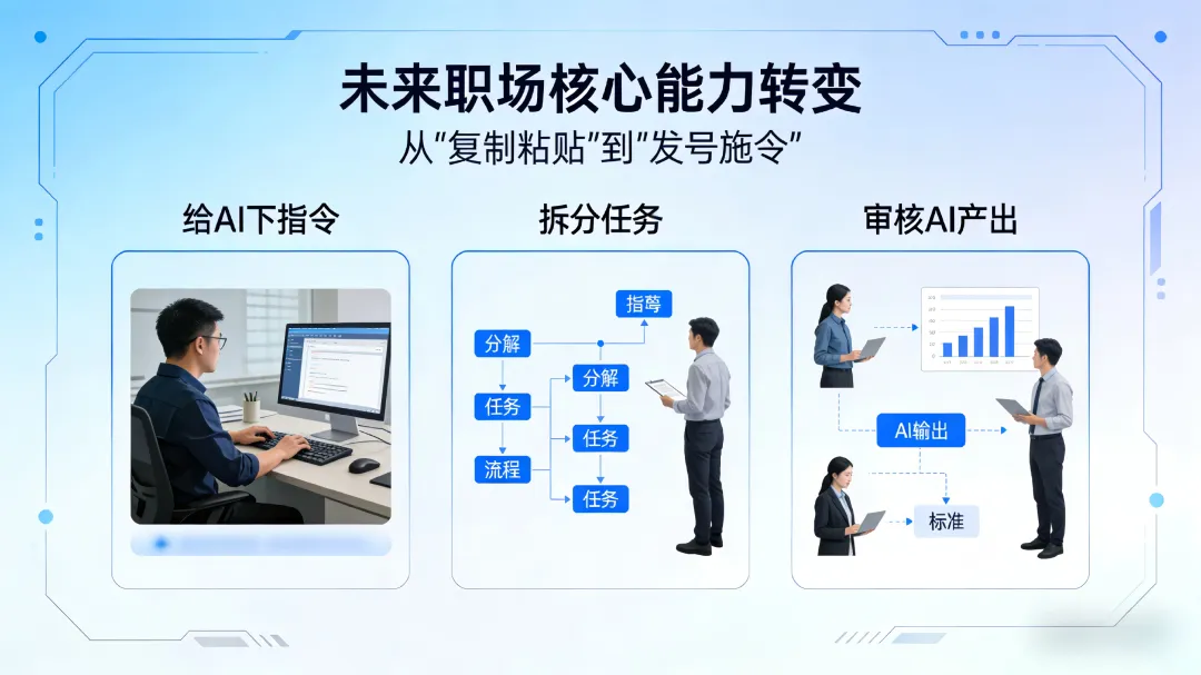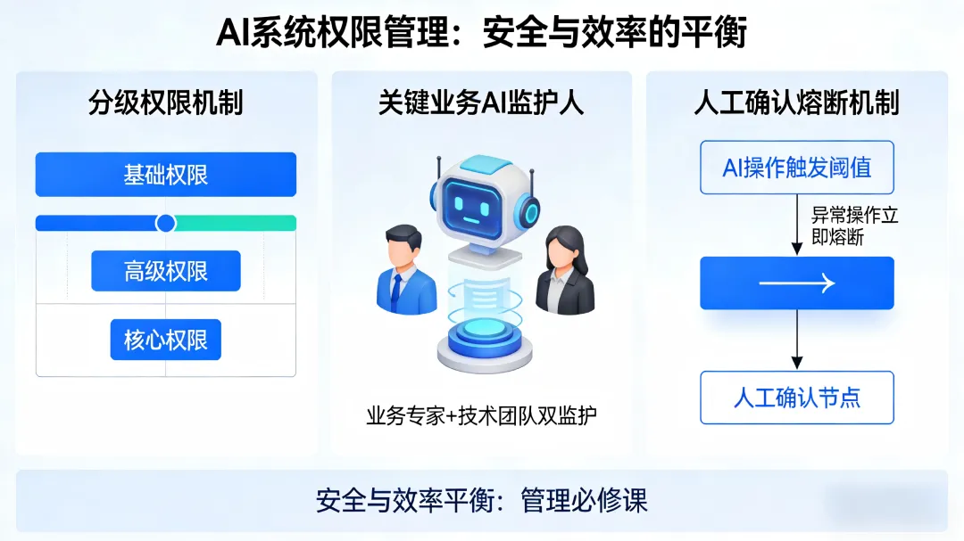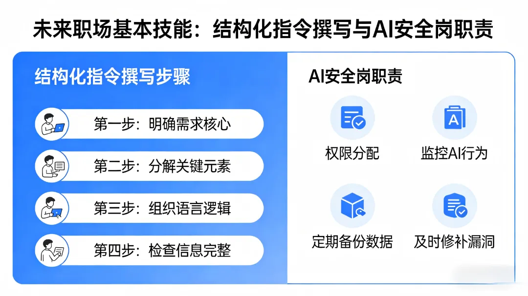 全员指令素养:教会员工用自然语言清晰表达需求,结构化撰写指令。这是未来职场的基本技能。 设立AI安全岗:负责权限分配、监控AI行为、定期备份数据,及时修补漏洞。