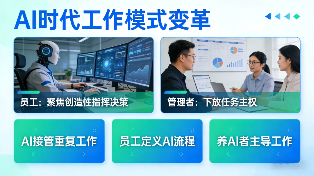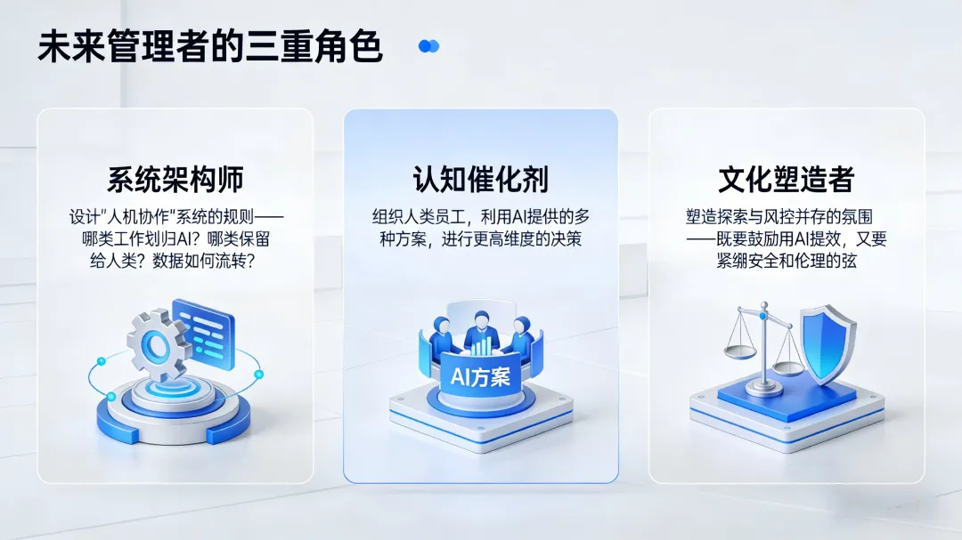 系统架构师:设计“人机协作”系统的规则——哪类工作划归AI?哪类保留给人类?数据如何流转? 认知催化剂:组织人类员工,利用AI提供的多种方案,进行更高维度的决策。 文化塑造者:塑造探索与风控并存的氛围——既要鼓励用AI提效,又要紧绷安全和伦理的弦。