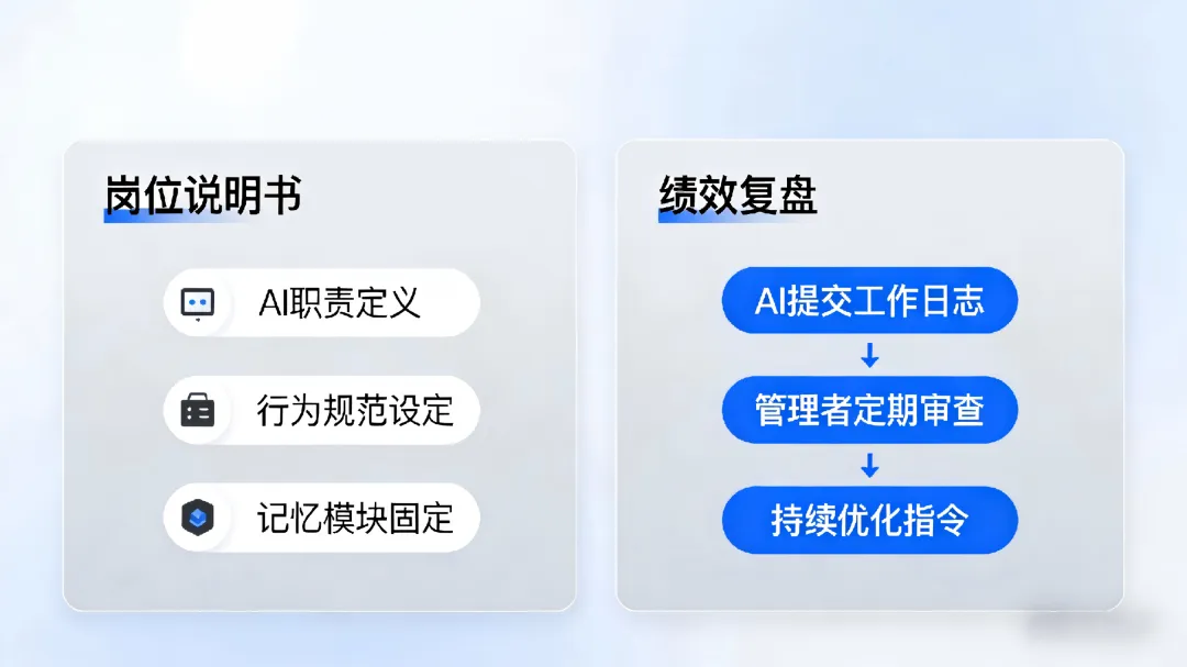岗位说明书:为每个AI定义职责,固定其行为规范和记忆模块。 绩效复盘:让AI提交工作日志,管理者定期审查,就像审阅员工日报,持续优化指令。