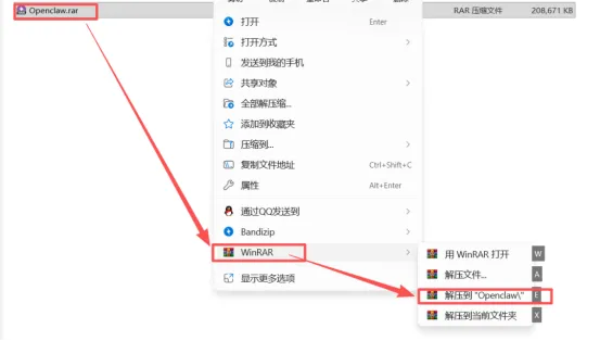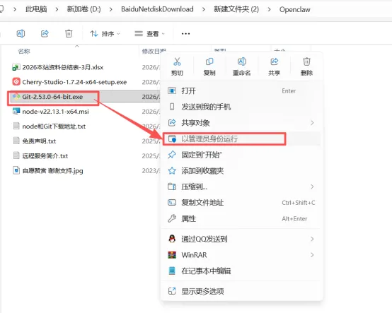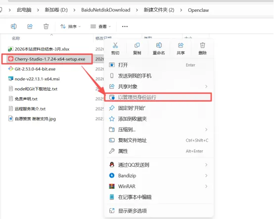 1、解压压缩包。2、进入【Openclaw】文件夹。3、以管理员身份运行【Cherry-Studio-1.7.24-x64-setup】。4、点【下一步】。5、点【安装】。6、稍等片刻。7、点【完成】。8、点右上角设置图标。9、输入:openrouter,点击【OpenRouter】。10、点【点这里获取密钥】。11、点【Sign up】。12、输入邮箱和注册账户密码,点【I agree...】。点【Continue】。13、进入邮箱里面找到OpenRouter邮件,点击【Sign up to OpenRouter】。14、返回网页,选择【Other/Not sure】,点击【Continue】。15、点【Create API Key】。16、点【Create】。17、在Name栏输入【yyrjm】,点【Create】。18、复制生成的key密钥,Key界面只会出现这一次,所以建议把Key在保存在记事本里。19、在API密钥栏粘贴上一步复制的Key。20、右边模型hua'dao滑到最下方,点【添加】。21、在模型ID栏输入【stepfun/step-3.5-flash:free】,点【添加模型】。22、点【首页】。23、点切换模型。24、选择【stepFu/step-3.5-flash:free】。25、简单对话进行测试一下,正常回复即配置完成。配置OpenClaw26、点“+”。27、点【Openclaw】。28、这里可以分别下载最新的【Node.js】和【Git】,也可以直接运行安装解压后文件夹中的【Node.js】和【Git】。29.返回解压的【Openclaw】文件夹,双击运行【node-v22.13.1-x64.msi】安装包(Node.js下载地址:https://nodejs.org/en/download)30.点【Next】。31.点【I accept...】,点【Next】。32.点【Next】。33.点【Next】。34.点【Next】。35.勾选【Automatically...】点【Next】。36.点【Install】。37.耐心等待软件安装过程。38.点【Finish】。39、提示【按任意键继续...】,我们就随意按一下键盘。40、跳出一个窗口跑代码,它在后台帮你装配套工具,等待它完成。41、以管理员身份运行【Git-2.53.0-64-bit】。42、点【Next】。43、点【Next】。44、点【Next】。45、点【Next】。46、点【Next】。47、点【Next】。48、点【Next】。49、点【Next】。50、点【Next】。51、点【Next】。52、点【Next】。53、点【Next】。54、点【Next】。55、点【Install】。56、耐心等待软件安装过程。57、点【Finish】58、返回OpenClaw安装界面,点击【安装OpenClaw】。59、耐心等待软件安装过程。60、选择【stepFu/step-3.5-flash:free】模型,点【启动】。61、OPENCLAW安装完成。如果觉得好用欢迎大家分享给身边的小伙伴!