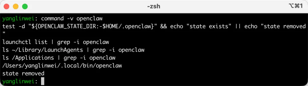 command -v openclawtest -d "${OPENCLAW_STATE_DIR:-$HOME/.openclaw}" && echo "state exists" || echo "state removed"launchctl list | grep -i openclawls ~/Library/LaunchAgents | grep -i openclawls /Applications | grep -i openclaw