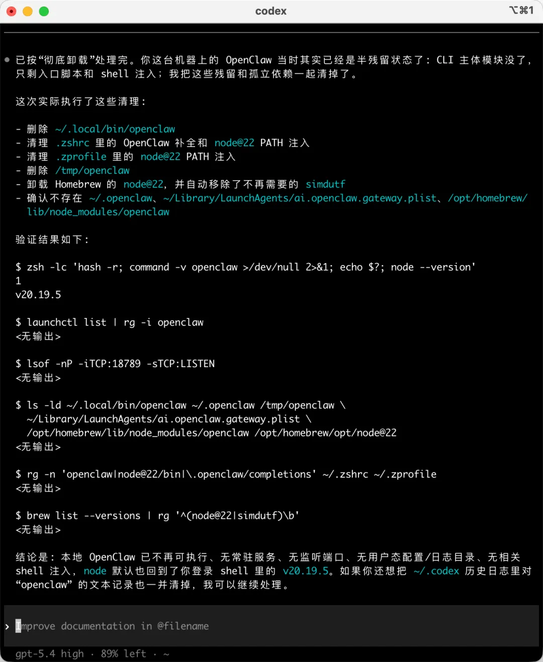 如果你以前使用过多 profile,还要顺手检查是否存在类似 ~/.openclaw-test、~/.openclaw-prod 这样的目录,一并删除。
