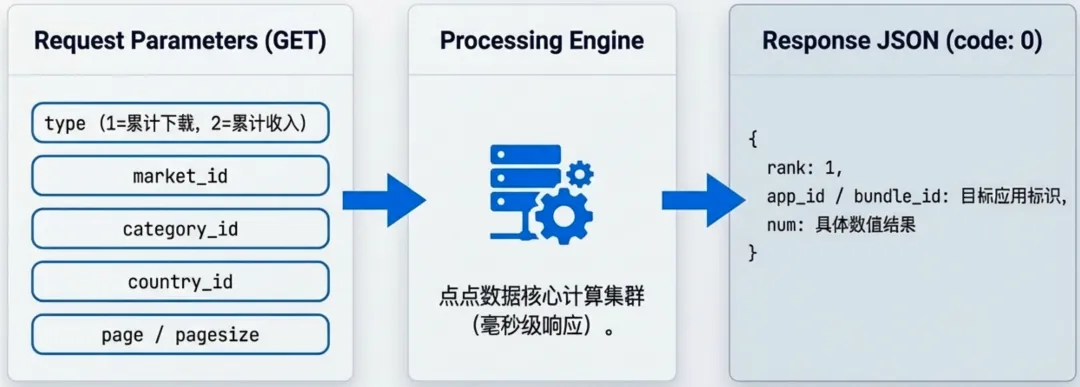 iOS(market_id=1):自动传 app_id安卓(market_id≥2):自动传 bundle_id信息接口 POST、榜单接口 GET,OpenClaw 自动判断,无需开发者编码。
