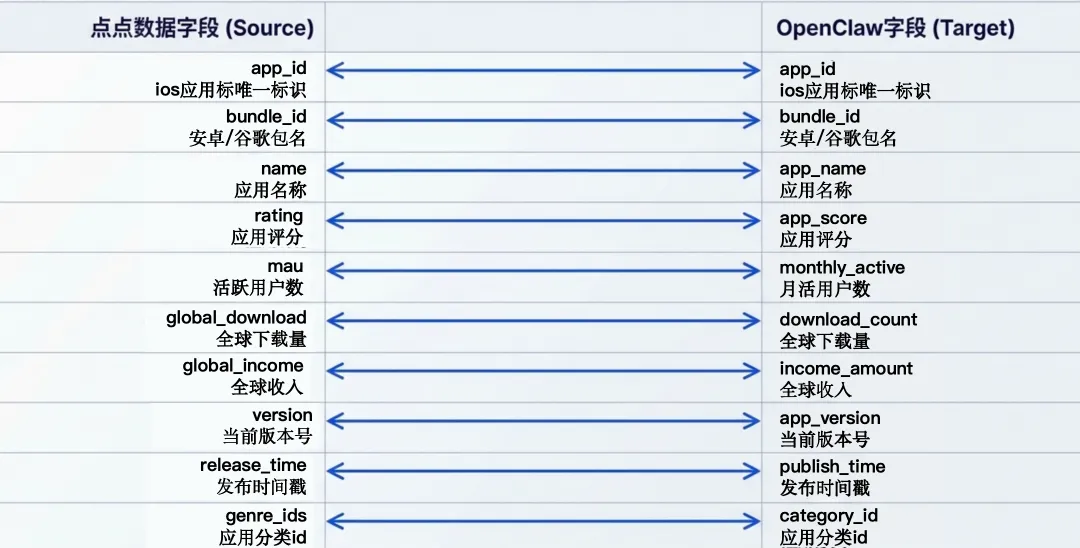 点点 API 字段→OpenClaw 标准数据模型自动映射,无需手动配置:
